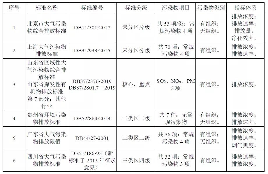 國家大氣汙染物綜合排放標(biāo)準(GB16297-1996)發(fā)布於1996年,1997年開始實施,標準較老,標準限值均較鬆。全國已有(yǒu)廣東省、山東省、貴(guì)州省(shěng)、四川省等省份均已製定了地方綜合排放標準,如下表(biǎo)所(suǒ)示。