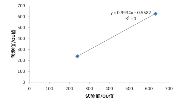 德國 PEN3.5 電子鼻有很大的優勢(shì),而且做(zuò)了大量的跟三點比較(jiào)式(shì)臭(chòu)袋法對比(bǐ)的實驗測試,結果具有很強的相關性和一致(zhì)性。通過建立針對特定區域的模板文件,可直接得出惡臭強度 OU 值。監測各路段惡臭強度(dù)的(de)變化,有利於掌控汙染(rǎn)程度,從而有效應對相關投訴。目前,檢測惡臭強度的(de)標準方(fāng)法是三點比較式臭袋法,也是(shì)各個領域內使用(yòng)最多、認可度最多的方法。PEN3.5電子(zǐ)鼻將儀器(qì)曲線(xiàn)與以三點臭袋法(fǎ)為依據的嗅辨員數據結合,通過偏最小二(èr)乘回歸法(fǎ)(PLS)建立適用性強、穩定性好的模板文件,可以對未知樣的惡臭強度進行有(yǒu)效地預測。本實驗選用樣品 5#和 13#,電子鼻檢測的惡臭強度預測值分別為 631.5903 和 239.0117,嗅辨員的評價結果分別為 628 和(hé) 238,二者的擬合(hé)曲線擬合度(dù) R2 為 1 ,達到了完美的預測效果。證明 PEN3.5 電子鼻在預測未知樣(yàng)品惡臭強(qiáng)度 OU 值上準確性極高,有很好的實用價值。